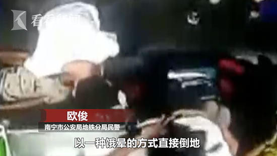 南宁市公安局地铁分局民警欧俊:“以一种饿晕的方式直接倒地,不知情的乘客就看见他,首先就是将他扶起来,有吃喝的可能会给他,因为他当时说的理由就是饿晕。”